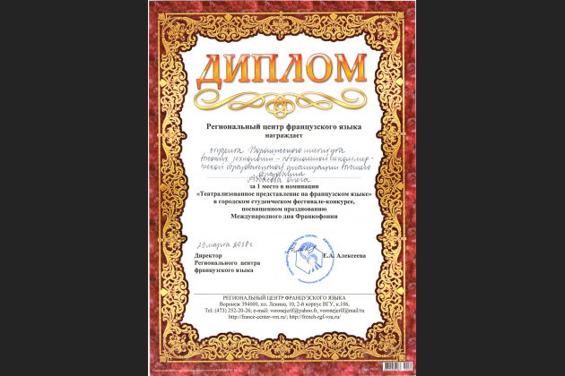 Участники фестиваля получают грамоты, призы и подарки. В празднике, посвященном празднованию международного дня Франкофонии, традиционно принимают участие и становятся лауреатами студенты Воронежского института высоких технологий, изучающие французский язык в качестве первого или второго иностранного языка. В этом году в конкурсе принимал участие и занял 1 место в номинации «Театрализованное представление на французском языке» студент направления «Информационные системы и технологии» Аббасов Олег. Наши поздравления!