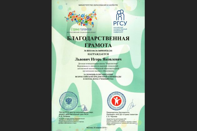 Ректор ВИВТ Львович И. Я. и детская компьютерная школа ВИВТ "Перспектива" получили благодарственную грамоту за помощь в организации всероссийской предметной олимпиады II поток 2015/16 учебного года.
