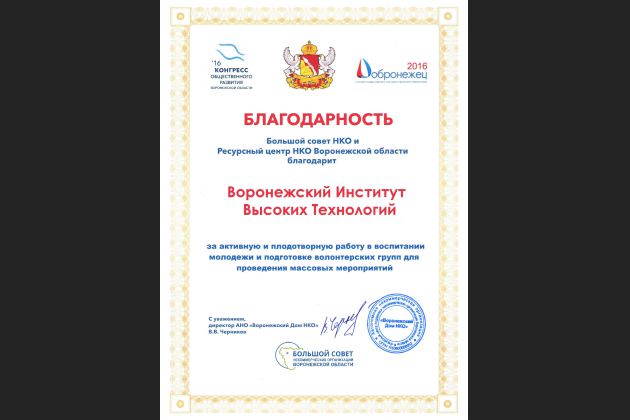 Открыл мероприятие председатель Большого совета НКО Воронежской области В. В. Черников. Он вручил благодарности за активную и плодотворную работу в воспитании молодежи и подготовке волонтерских групп для проведения массовых мероприятий Воронежскому институту высоких технологий, ректору И. Я. Львовичу, проректору по ОВР А. В. Багрянцеву и руководителю Центра гражданской взаимопомощи Г. А. Перепелицыной. Также благодарности, памятные значки «Добронежец» и контрамарки на посещение кинотеатра были вручены студентам, которые принимали активное участие в организации и проведении Конгресса общественного развития Воронежской области и IV Большого Гражданского форума Совета НКО Воронежской области.