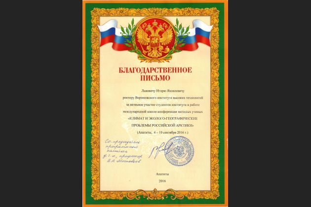 Воронежский институт высоких технологий представляла студентка Тамара Мельникова с докладом по развитию Арктических территорий с помощью развития туризма и по организации поставок продовольственных продуктов, угля, леса и других ресурсов, а также по возрождению Северного морского пути. Данную тему она рассмотрела с экономической стороны. Участников конференции заинтересовал ее доклад, поскольку большинство рассматривали проблему развития Севера с географической, экологической и атмосферной сторон.