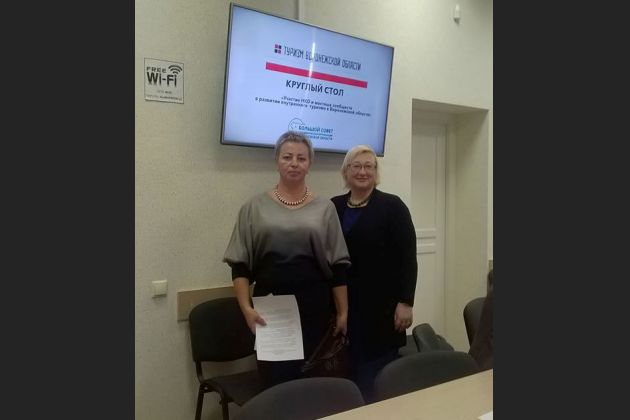 Руководитель ЦГВ-Воронеж Г. А. Перепелицына и преподаватель ВИВТ С. Г. Фёдорова 15 ноября приняли участие в работе круглого стола «Участие НКО и местных сообществ в развитии внутреннего туризма в Воронежской области». Круглый стол прошел в Ресурсном центре НКО в рамках сотрудничества Большого света НКО с департаментом культуры Воронежской области.