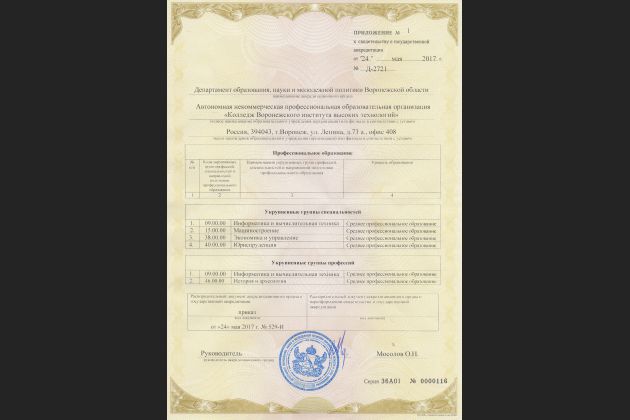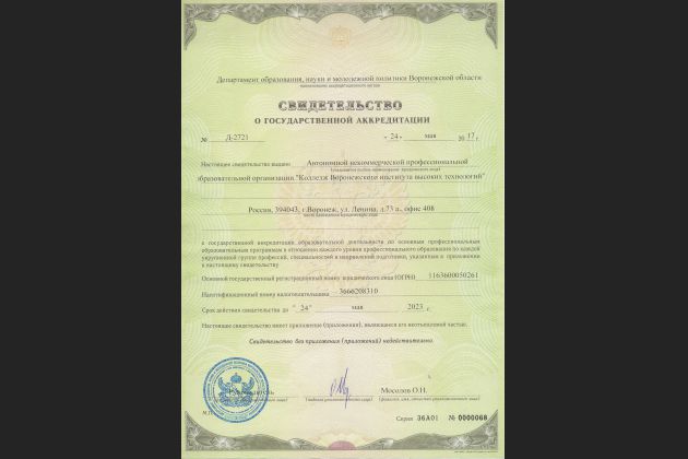 Колледж Воронежского института высоких технологий успешно прошел процедуру государственной аккредитации образовательной деятельности. Департамент образования, науки и молодежной политики Воронежской области выдал колледжу ВИВТ Свидетельство, подтверждающее его государственную аккредитацию до 24 мая 2023 года.
