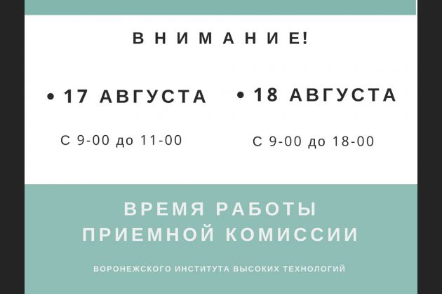Обратите внимание, что в четверг - 17 августа время работы приемной комиссии ВИВТ с 9-00 до 11-00!