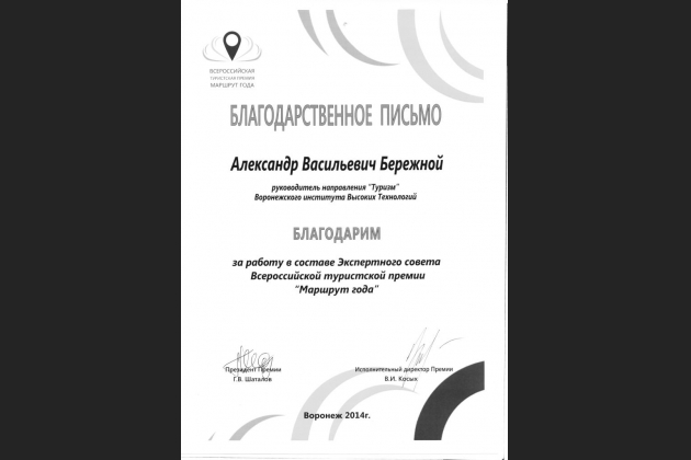 15-16 ноября в Воронеже на базе гостиничного комплекса АМАКС-Парк Отель прошел финал Всероссийской туристской премии «Маршрут года». В 2014 году на конкурс проступило 263 проекта из 63 регионов страны, в финальную часть конкурса вышли 134 проекта из 71 населенных пункта, представляющих 42 региона страны. Премия проводилась при поддержке Федерального агентства по туризму, Департамента культуры и архивного дела Воронежской области и Департамента природных ресурсов и экологии Воронежской области.