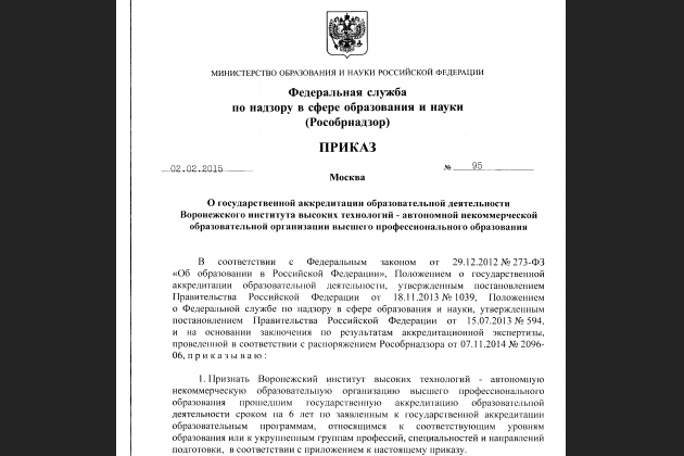 2 февраля 2015г. вышел Приказ Рособрнадзора №95 о признании Воронежского института высоких технологий прошедшим государственную аккредитацию образовательной деятельности сроком на 6 лет по заявленным образовательным программам с выдачей соответствующего свидетельства о государственной аккредитации.