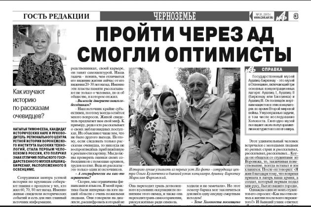 О том, как сотрудники центра устной истории собирают знания о прошлом у тех, кто жил 60, 70, 80 лет назад, читайте в статье «Пройти через ад смогли оптимисты»в выпуске еженедельника "Аргументы и Факты - Черноземье" № 31 от 29.07.2015.