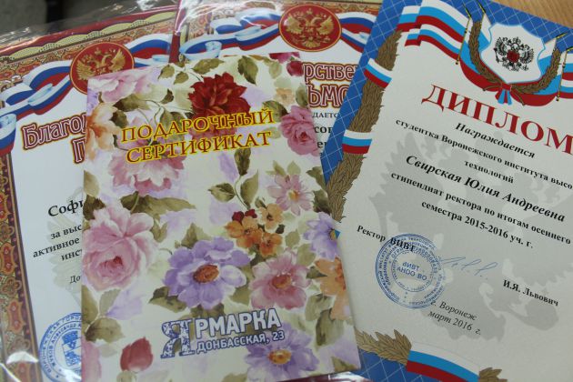 По сложившейся в нашем вузе традиции лучшим из лучших также вручаются благодарственные письма и сертификаты депутата Воронежской городской Думы, основателя благотворительного фонда «Доброта» Александра Алексеевича Жукова. Вручил их помощник депутата Александр Викторович Завьялов. Дипломы за отличные успехи в учебе студентам ВИВТ вручил ректор ВИВТ Игорь Яковлевич Львович. Списки стипендиантов были торжественно завизированы в памятной книге вуза.