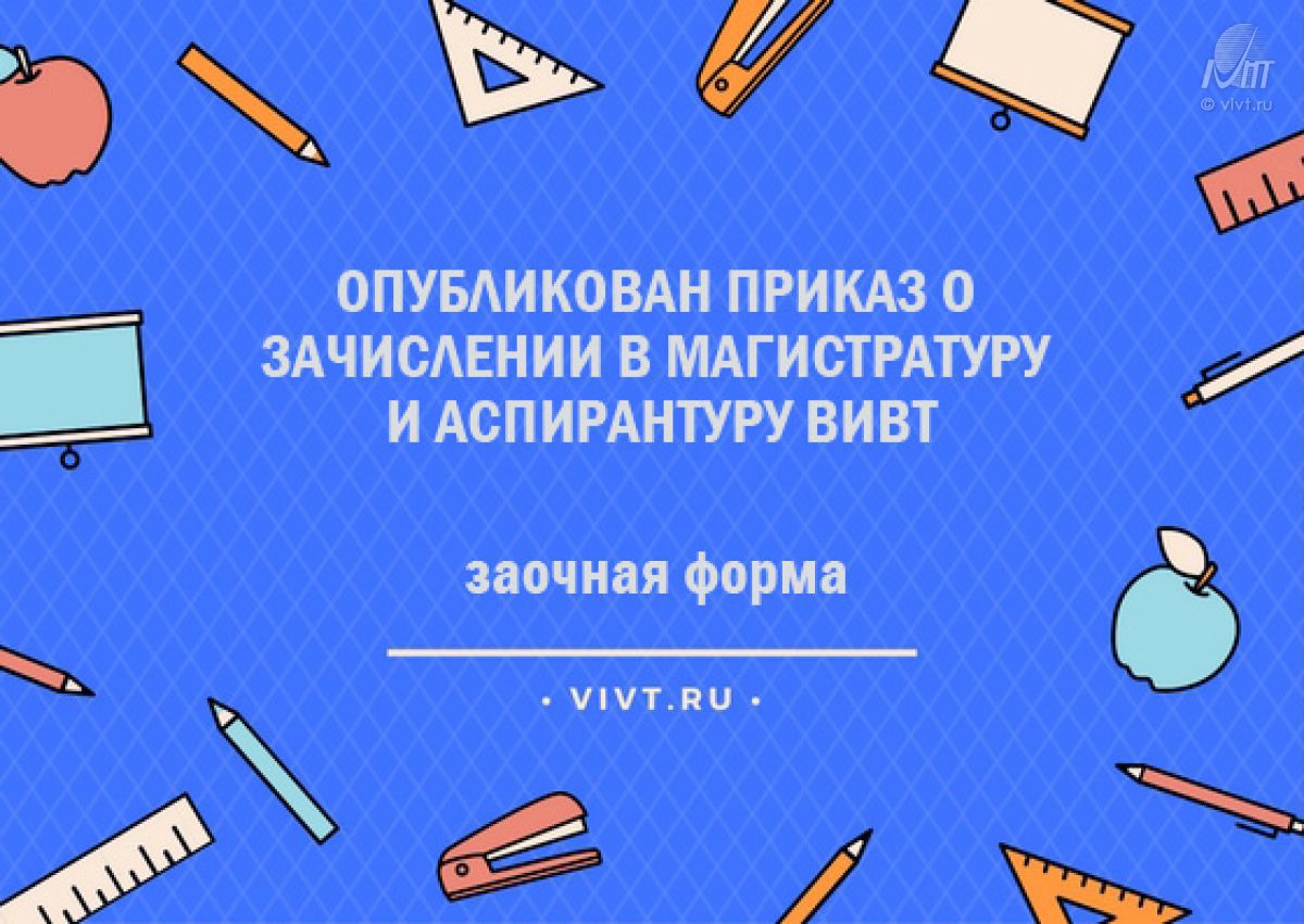 Опубликован приказ о зачислении абитуриентов в магистратуру и аспирантуру ВИВТ заочной формы обучения. Поздравляем всех, кто вступил в ряды студентов ВИВТ!