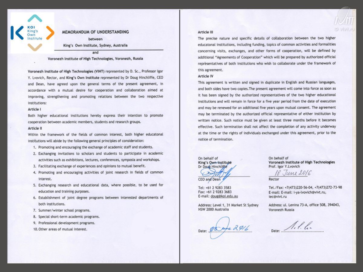 В рамках развития международных отношения в июле 2016 года Воронежский институт высоких технологий подписал меморандум о сотрудничестве в области образования с австралийским частным университетом KING`S OWN INSTITUTE (KOI)(koi.edu.au/wp/), располагающемся в городе Сиднее. Ведется работа по подготовке совместных гибридных программ бакалавриата и магистратуры по направлению "Менеджмент".