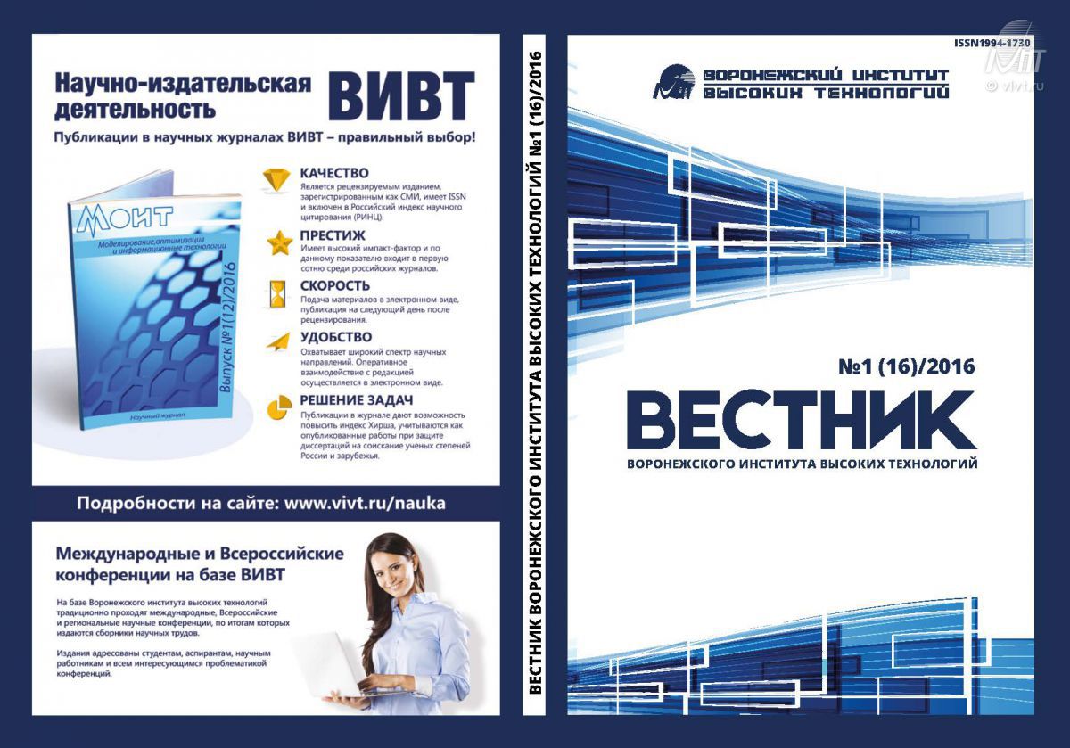 Вышел первый в этом году обновленный выпуск научного журнала «Вестник ВИВТ». Научный журнал «Вестник Воронежского института высоких технологий» (Вестник ВИВТ) – рецензируемый научный журнал, издающийся с 2007 года. Является мультидисциплинарным журналом, публикует научные обзоры, статьи проблемного и научно-практического характера. С 2016 года выходит 4 раза в год.
